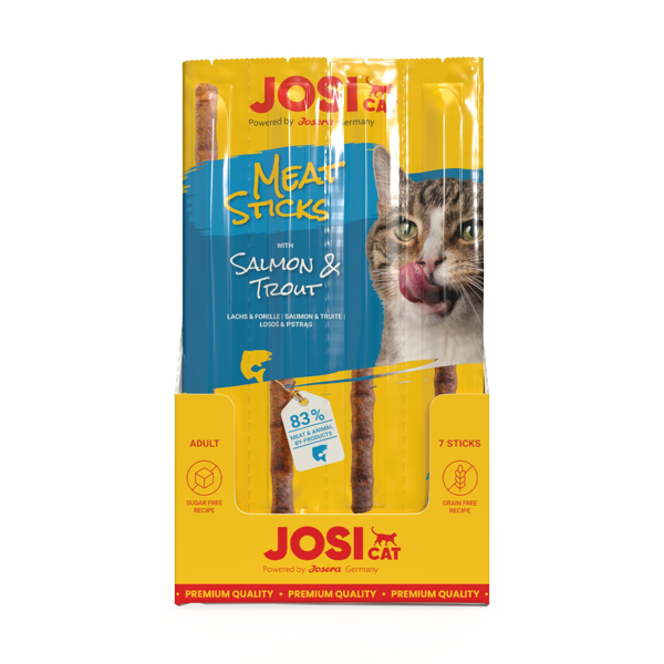 Prekės kodas: 229689 - Prekės aprašymasJOSICAT Meat Sticks skanėstai katėms su lašiša 35g