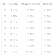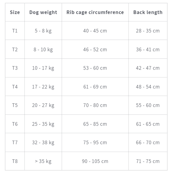 Išmatavimai: (T2) Šuns svoris: 8-10 kg; Krūtinės apimtis: 46-52 cm; Nugaros ilgis: 36-41 cm