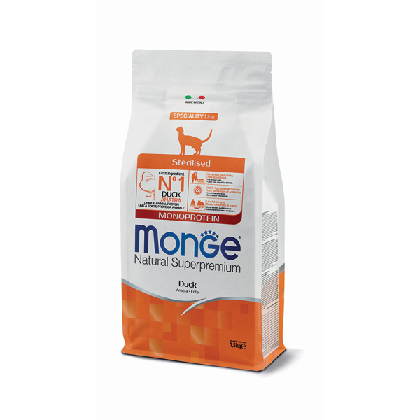 Prekės kodas: 231172 Monge Monoprotein Sterilized sausas pašaras suaugusioms sterilizuotoms katėms antiena 10 kg.