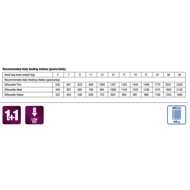 - Šėrimo rekomendacijosŠėrimo instrukcija: prieš vartojant ir pratęsiant vartojimą rekomenduojama pasitarti su veterinarijos gydytoju. Vidutinio dydžio (10 kilogramų) šuniui 600 g pašaro per dieną. Pasirūpinkite, kad gyvūnas visada turėtų švaraus ir šviežio geriamo vandens. Rekomenduojama šėrimo trukmė ūmių žarnyno absorbcijos sutrikimų mažinimui- 1-2 savaitės, virškinimo sutrikimų kompensavimui- 3-12 savaičių.