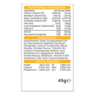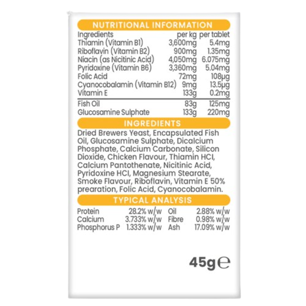 - Sudėtisdžiovintos alaus mielės, inkapsuliuoti žuvų taukai, gliukozamino sulfatas, dikalcio fosfatas, kalcio karbonatas, silicio dioksidas, vištienos kvapai, tiamino HCl , kalcio pantotenatas, nikotininė rūgštis, piridoksino HCl, magnio stearatas, dūmo kv.suteik. priedai, riboflavinas, vit.E, folinė rūgštis, ciankobalaminas. Vitaminas B1 (Thiamine) 3600mg Vitaminas B2 (Riboflavin) 900mg Nikotininė rūgštis (Niacin) 4050mg Vitaminas B6 (Pyridoxine) 3360mg Folinė rūgštis 72mg Vitaminas B12 (Cyanocobalamine) 9mg Vitaminas E (Alpha-Tocopheryl Acetate) 133mg Žuvų taukai 83g Glucosamino sulfatas 133g Baltymai 28,2% Riebalai 2,88% Ląsteliena 0,98% Kalcis 3,733% Pelenai 17,09% Fosforas 1,333%