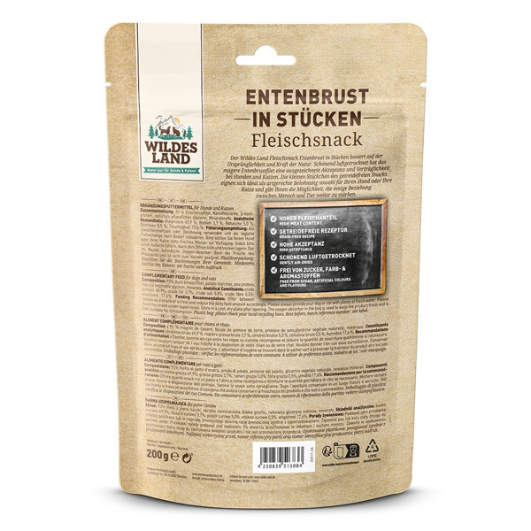 WILDES LAND Fleischsnacks Duck Breast Pieces užkandis šunims ir katėms su antiena, 200 g
