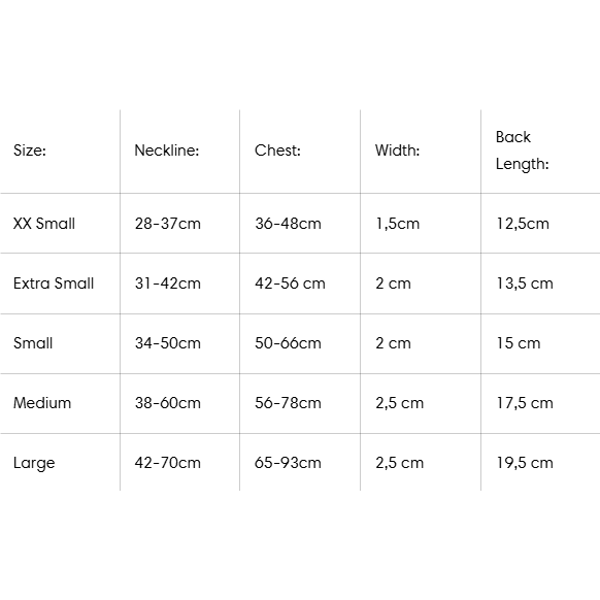 Išmatavimai: Kaklo apimtis: 34-50 cm; Krūtinės apimtis: 50-66 cm; Nugaros ilgis: 15 cm; Dirželio plotis: 2 cm - Sudėtis100 % perdirbtas poliesteris (PET).