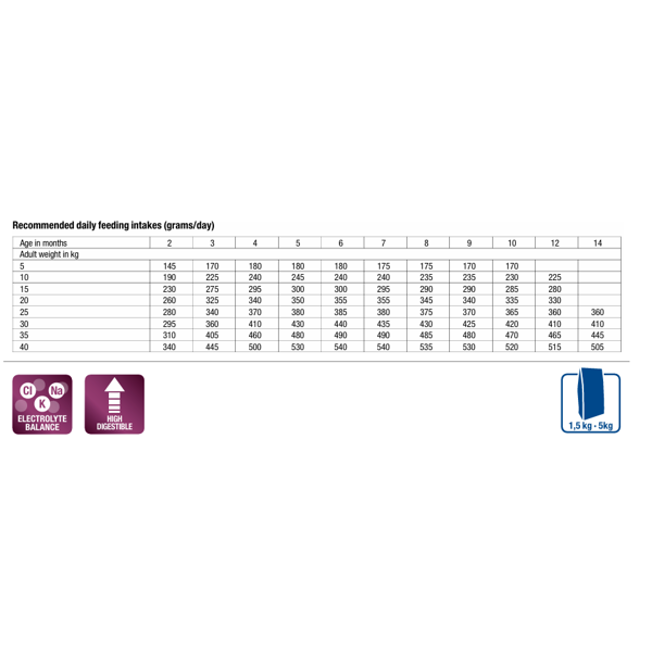 - Šėrimo rekomendacijosPrieš pradedant šerti pasitarkite su veterinarijos gydytoju. Rekomenduojama paros racioną sušerti padalinus į 2 šėrimus. Pasirūpinkite,kad gyvūnas visada turėtų švaraus ir šviežio geriamo vande