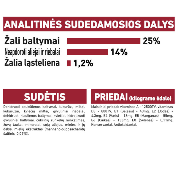 - SudėtisDehidratuoti paukštienos baltymai, kukurūzų miltai, kukurūzai, kvietiniai miltai, gyvuliniai riebalai, dehidratuoti kiaulienos baltymai, kviečiai, hidrolizuoti gyvuliniai baltymai, burokėlių minkštimas, žuvų taukai, mineralai, sojos aliejus, mielės ir jų dalys, hidrolizuotos mielės (mano- oligo-sacharidai (0,05%)). Maistiniai priedai (1kg): Vitaminas A: 12500 TV, Vitaminas D3: 800 TV, E1 (geležis): 43 mg, E2 (jodas): 4,3 mg, E4 (varis): 13 mg, E5 (manganas): 55 mg, E6 (cinkas): 133 mg, E8 (selenas): 0,11 mg - konservantai - antioksidantai. Analitinės sudedamosios dalys: Baltymai: 25,0% - Riebalų kiekis: 14,0% - Žali pelenai: 6,1% - Žali pluoštai: 1,3% - Viename kilograme: Omega 3 riebalų rūgštys: 6,0 g, įskaitant EPR / DHR: 3,1 g.