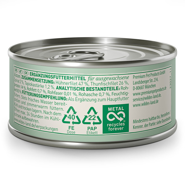WILDES LAND Filet konservai katėms su vištiena, tunu ir špinatais 80 g