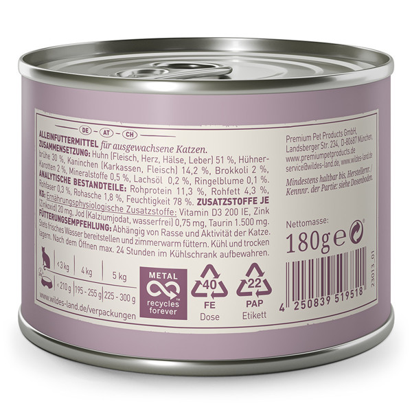 Prekės kodas: 105333 Konservai katėms su triušiena, vištiena, brokoliais, morkomis, medetkomis ir lašišų aliejumi – be grūdų, cukraus, dažiklių ir konservantų.